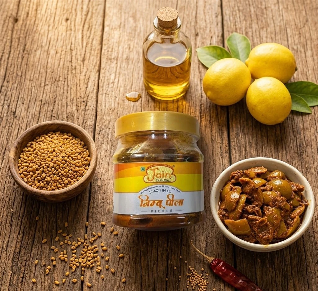 Experience the bold taste of Neembu Peela lemon pickle in oil 400g by Jain Pickle Wala. This homemade lemon pickle uses fresh yellow lemons, rich oil, and traditional Indian spices. As a result, it delivers a strong tangy and spicy flavor.