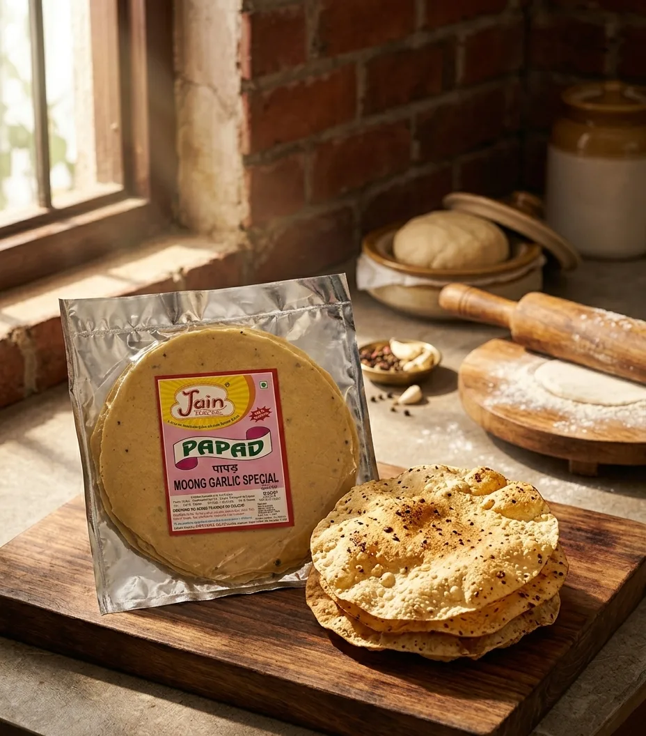 Experience the irresistible taste of Jain Pickle Wala Moong Garlic Special Papad, a perfect blend of tradition and bold flavor. Made using high-quality moong dal and infused with the rich aroma of garlic, this papad delivers a crunchy texture and mouth-watering taste that complements every Indian meal.